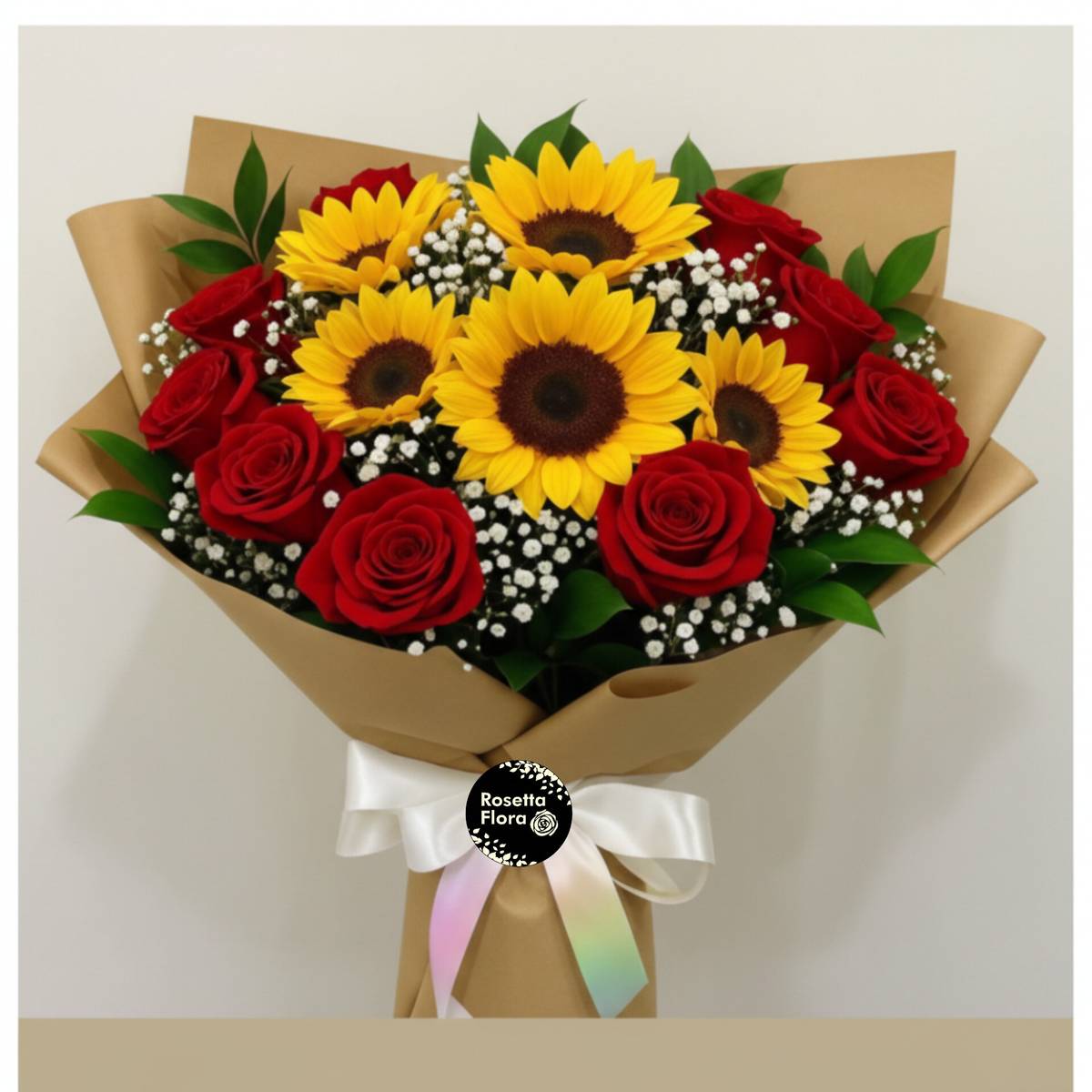 Bring joy and romance together in one stunning bouquet! This vibrant arrangement features 10 fresh red roses, 5 sunny sunflowers, and 3 delicate baby’s breath stems, creating a perfect balance of elegance and happiness.