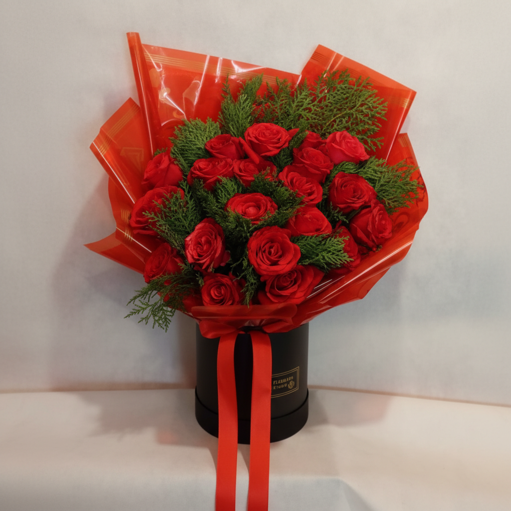 Classic elegance meets natural charm in this stunning 6-inch box arrangement, featuring 18 fresh red roses beautifully complemented with lush greenery. Designed to make a bold yet graceful statement, this floral box is perfect for Valentine’s Day, anniversaries, birthdays, and romantic surprises.