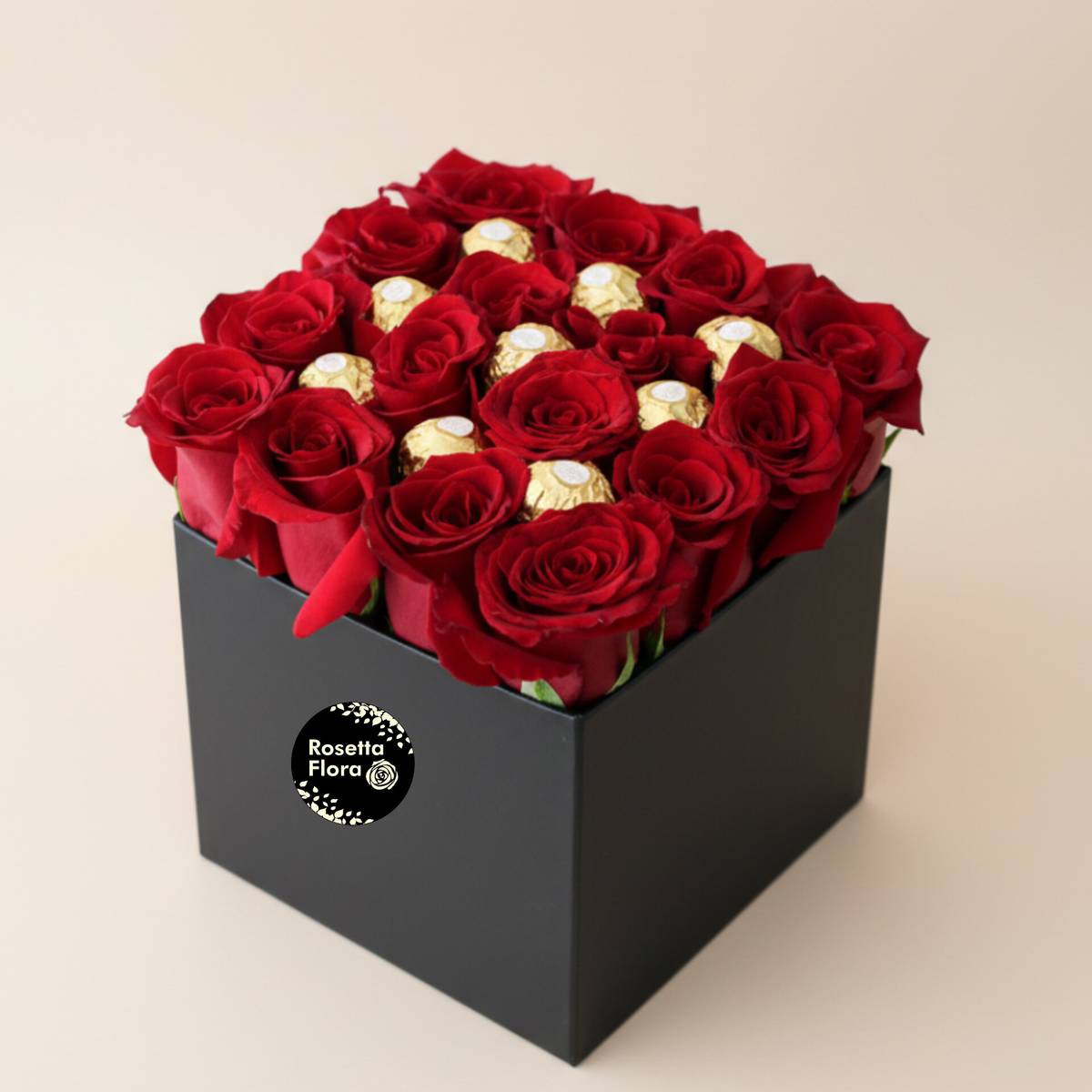 Make hearts skip a beat with this elegant box arrangement featuring 16 premium red roses paired with 9 Ferrero Rocher chocolates, beautifully presented in a stylish 8×8 gift box.
