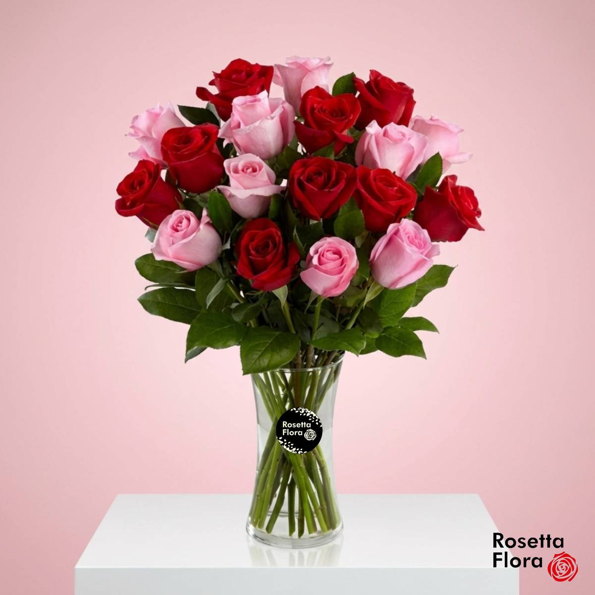 An elegant 12-inch vase arrangement with 18 mixed red and pink roses, styled with fresh greenery for a graceful floral gift.