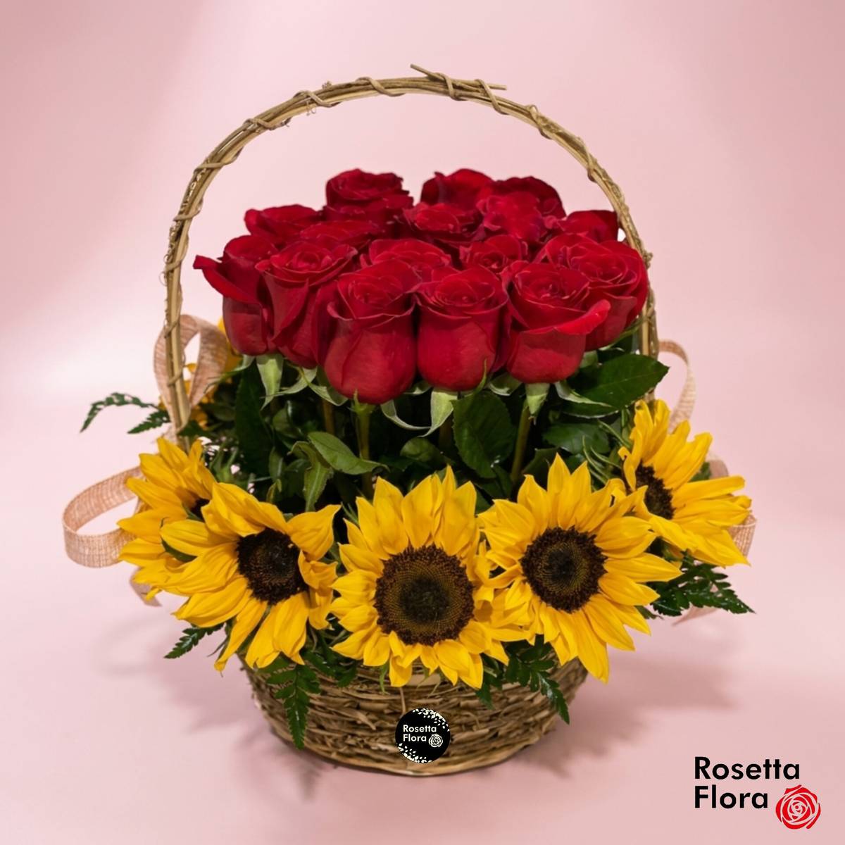 A bright and elegant basket arrangement of 12 red roses and 5 sunflowers, perfect for joyful and heartfelt gifting.